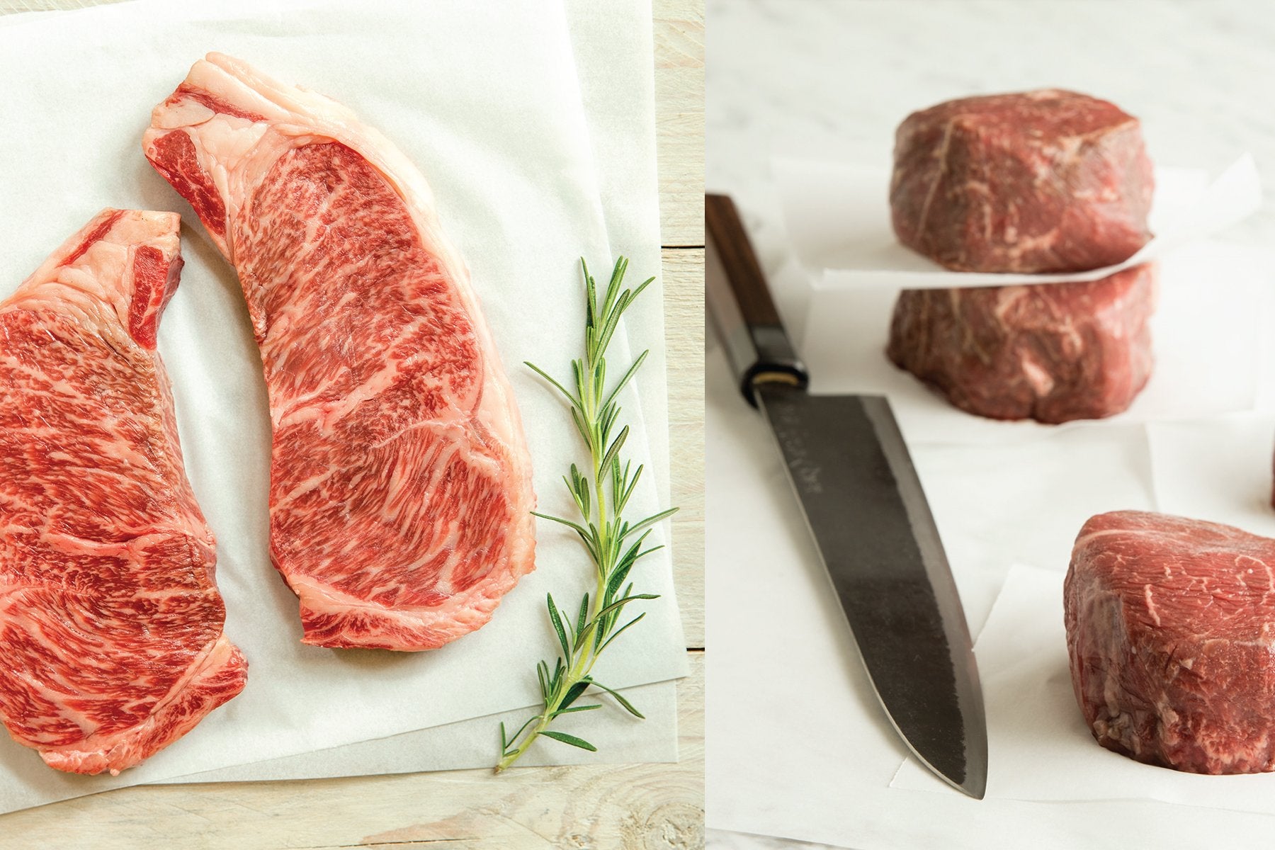 - Each set contains 2 Filet Mignon steaks and 2 Strip Steaks